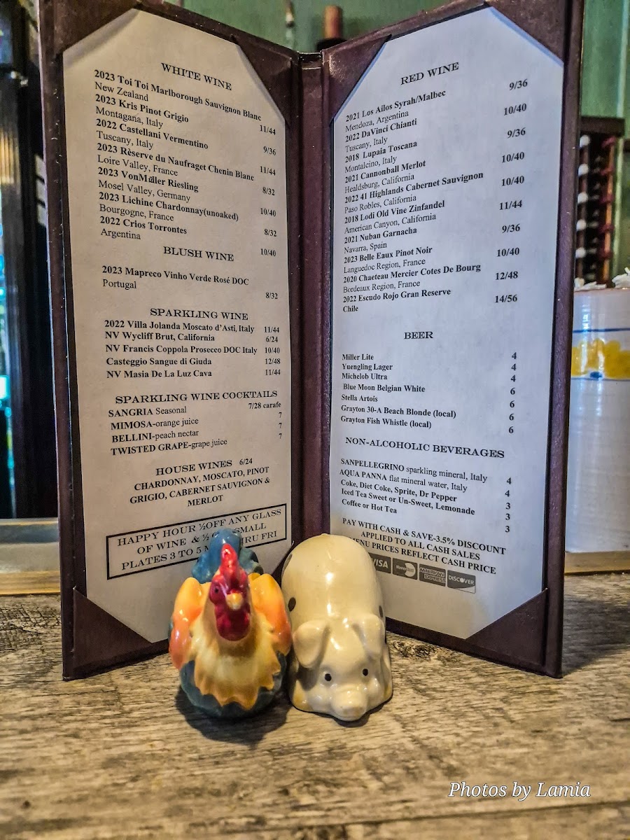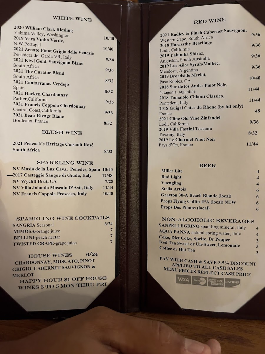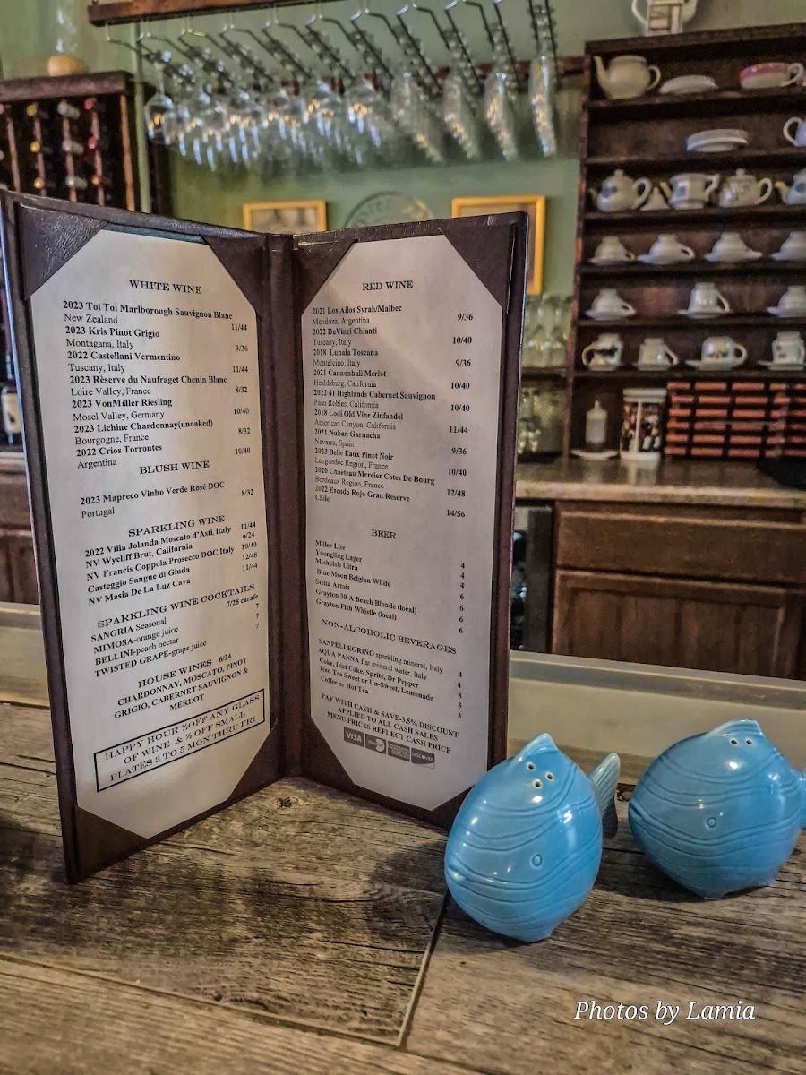 The wine selection is extensive, featuring whites like the crisp 2023 Kris Pinot Grigio and sparkling options such as 2022 Villa Jolanda Moscato D'asti.